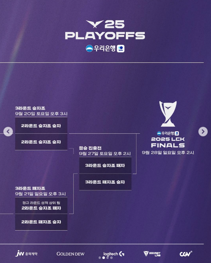 2025 LCK 플레이오프는 9월 10일부터 28일까지 진행되며, 롤드컵 4장의 시드가 걸린 치열한 무대입니다. 경기 일정·결과, 승자조·패자조 대진표, 최종 결승전과 시드 배정 방식을 정리했습니다.