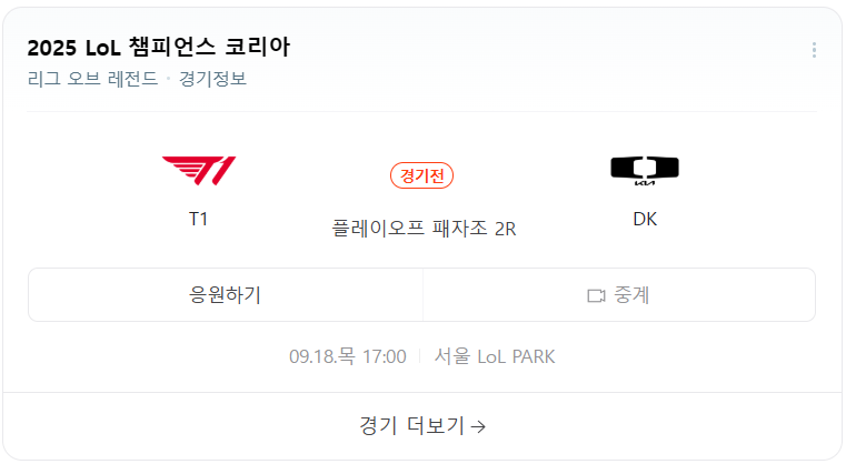 2025년 9월 18일(목) 오후 5시, 서울 종로구 LCK 아레나(롤파크)에서 T1과 디플러스기아(DK)가 패자조 2라운드 경기를 치릅니다.